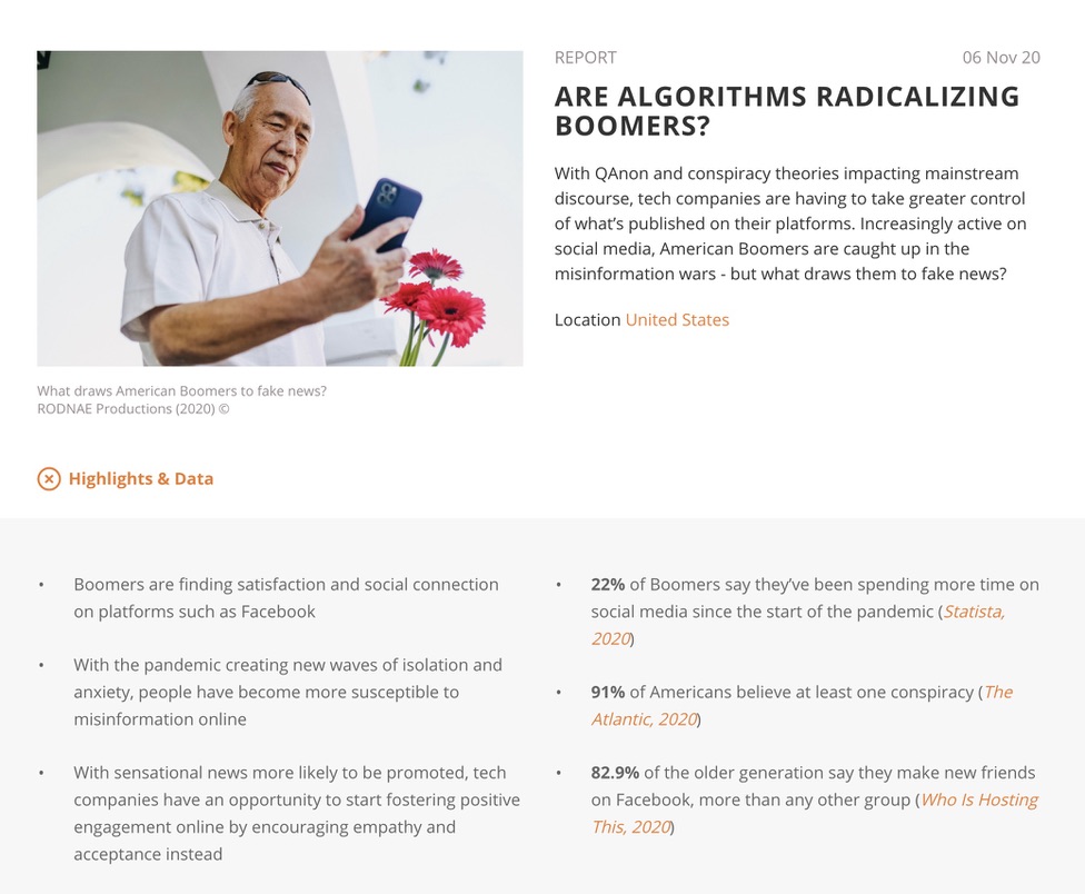*This data-driven report sits behind a paywall. It looks at content algorithms and fears that they are directing people towards more extremist content. It also examines how an older generation of internet users is both shaped by and shaping the digital world. As well as gathering recent data I spoke with experts Renée DiResta and Joseph Uscinski.